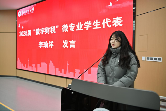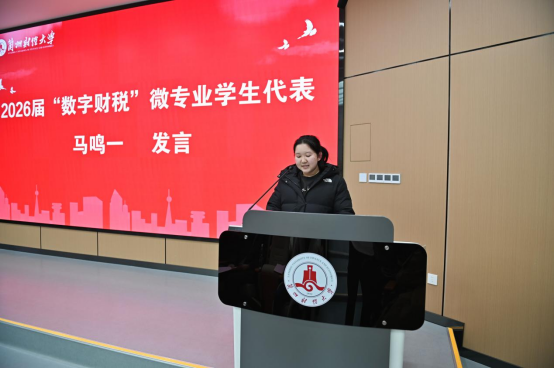 2026届“数字财税”微专业马鸣一同学在发言中表达了对即将开启的微专业学习之旅的憧憬与决心。她表示,“数字财税”微专业精准对接了当前财经学子能力升级的迫切需求,她将以饱满的热情投入学习,努力平衡本专业与微专业课程,深入掌握数字化工具,积极参与实践项目与学科竞赛,立志成长为符合时代要求的“数字财经”人才。