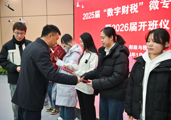 副校长南星恒为2025届“数字财税”微专业结业同学逐一颁发了结业证书,并合影留念。