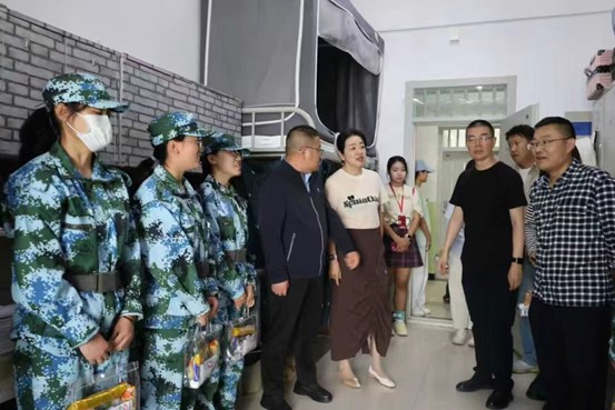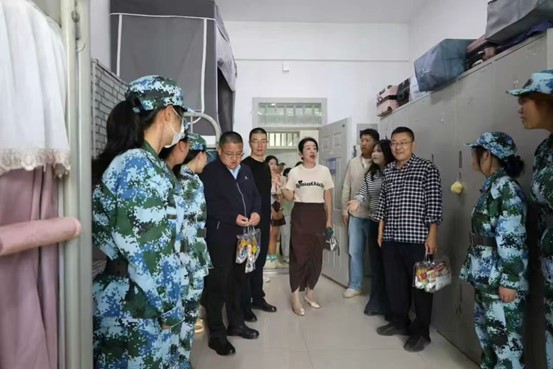 期间,各位领导老师与2025级新生们亲切交谈,细致询问大学生活适应情况、饮食住宿情况、军训训练强度以及身体状态,耐心倾听新生们的需求与心声,并叮嘱道:“军训是大学的‘第一课’,是锤炼意志、凝聚力量的重要经历。大家要听从教官指挥,既要刻苦训练,更要注意劳逸结合,遇到任何困难及时向班主任、辅导员、班助和教官求助,学院永远是你们最坚实的后盾。”