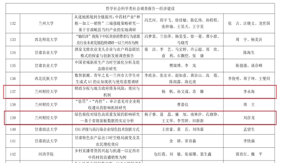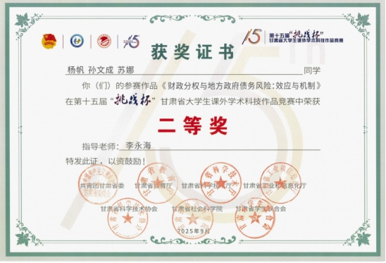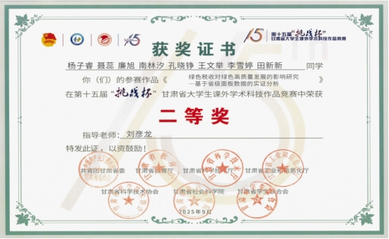 此次获奖作品紧扣甘肃发展需求,凸显财经特色:李永海老师指导的《财政分权与地方政府债务风险:效应与机制》,王彦平、苏晓玲、李兵红老师联合指导的《绿色技术创新驱动黄河上游生态屏障建设:机理、成效与实践路径》,刘彦龙老师指导的《绿色税收对绿色高质量发展影响一基于省级面板数据的实证分析》均获二等奖;张文斌老师指导的《财政科技投入对新质生产力的影响机制研究》获三等奖,相关研究为甘肃财政管理、生态保护、产业转型提供参考。