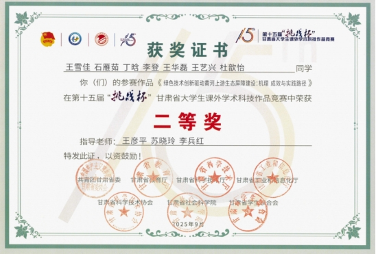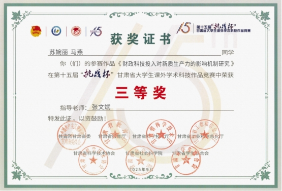 近日,第十五届“挑战杯”甘肃省大学生课外学术科技作品竞赛获奖名单正式发布,兰州财经大学学子凭借深厚的学科素养、扎实的调研能力与创新的学术视角在赛事中脱颖而出。其中,我院参赛团队表现尤为突出,共斩获二等奖3项、三等奖1项,不仅为学校赢得荣誉,更以“立足甘肃实际、紧扣学科特色”的作品风格,彰显了我院在应用型学术人才培养与服务地方发展领域的显著成效。
