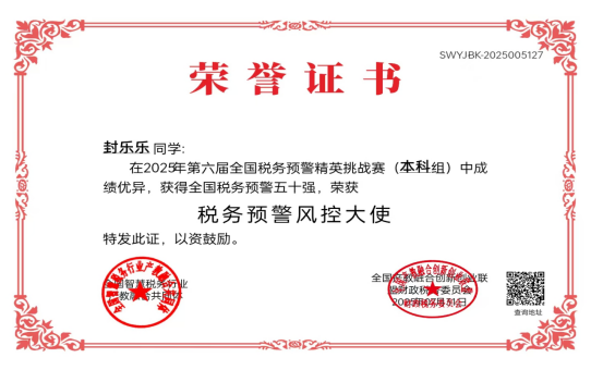 面对高强度的赛程与众多强手,我院学子凭借扎实的专业积累、严谨的逻辑分析和稳定的临场发挥脱颖而出:不仅斩获团体赛一等奖,2022级税收二班封乐乐更以优异表现跻身全国前50强,并荣获“税务预警风控大使”称号,充分展现了我院在税务专业人才培养方面的扎实成效与学子的过硬素养。