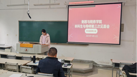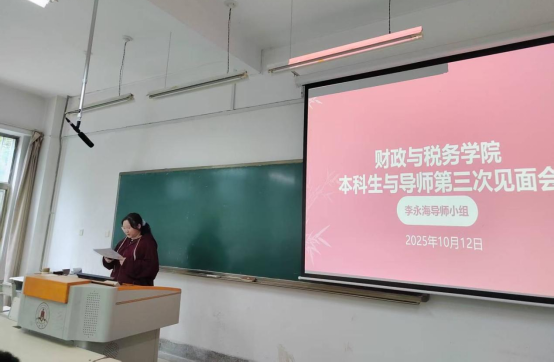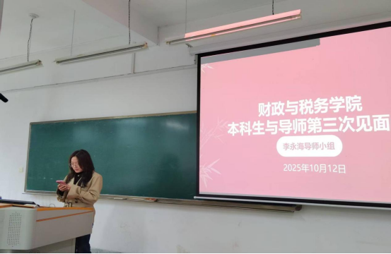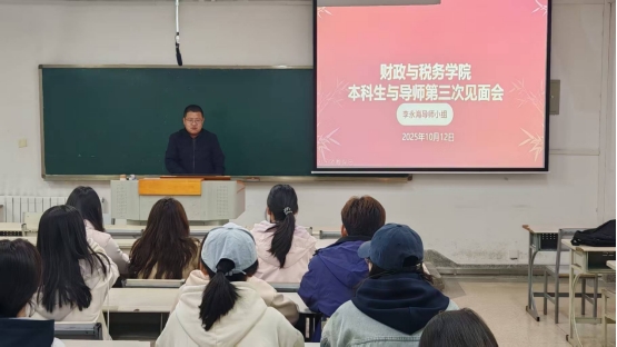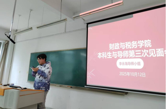 为响应学校“强教学”行动计划,落实财政与税务学院下发的《本科生导师制实施方案(试行)》文件要求,2025年10月12日上午,李永海导师组第三次本科生小组会议在志道楼108教室如期举行。本次会议聚焦学科竞赛经验分享、暑期作业汇报点评、新小组成员融入及学业发展规划指导等,内容丰富务实,为小组学生搭建了互学互鉴、明确方向的交流平台。