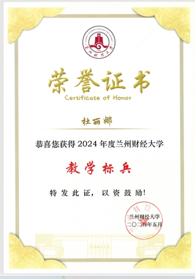 杜丽娜,财政与税务学院副教授,自2022年入校以来,系统主讲《财政学》《政府绩效管理》等专业核心课程。2024年,作为负责人立项甘肃省高等教育教学成果培育项目1项,荣获校级教学成果一等奖1项,荣获校级教学创新大赛二等奖1项;2025年荣获甘肃省陇原青年创新创业人才;2023年荣获校级教书育人先进个人、党员教书育人示范岗,主持完成校级教改类项目2项,参与校级教改类项目5项。从教期间,持续创新教学理念与方法,形成“思政引领-数智赋能-科研嵌入”的教学创新与实践,教学成果优异,育人成效显著,以“立德树人”为根本目标,春风化雨、匠心育人,以高度的责任感参与教学与学生管理工作。相信教育是一棵树摇动另一棵树,一个灵魂唤醒另一个灵魂。